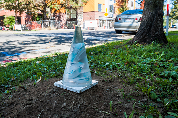 Stockton is creating traffic cone sculptures, some of which will be cast in a clear resin with found objects suspended in the sculpture. The clear cones will serve as curious time capsules of the neighborhood. Stockton is a mixed-media artist with a focus on found objects mixed media sculpture, drawing, collage, and painting.