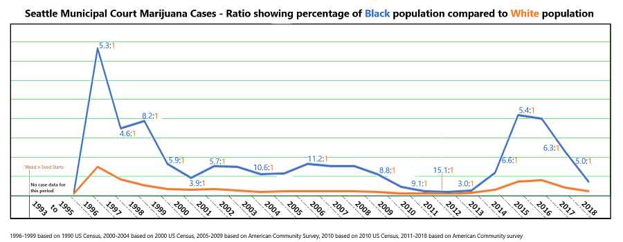 On Nov. 6, 2012, Washington state voters passed Initiative 502 making Washington state one of the first two states to legalize recreational marijuana possession and sales along with Colorado. Following the passage of Initiative 502, possession of small amounts of marijuana was legalized and the violations on record with Seattle Municipal Court is reflective. Violations shown from 2013 on are primarily for open public consumption of marijuana. The data set shown is using estimated U.S. Census data for 2019 population numbers in Seattle (The number of Black people living in Seattle is estimated to be similar to the 2010 figures). The lack of growth in the Black population during this time is attributed to gentrification.