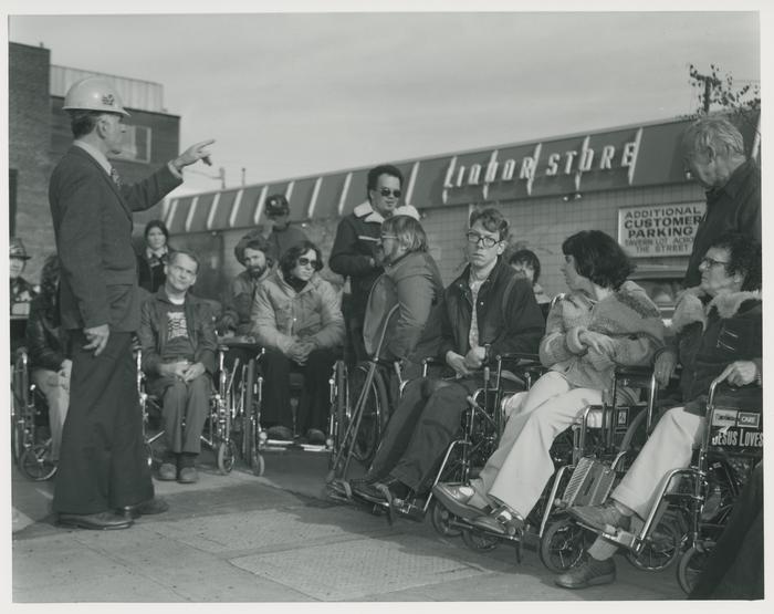 Pictured standing with two canes is Paul Wysocki, Director of the city's Handicapped Services Unit and later supervisor of the Human Rights Department's Affirmative Action/Disability Unit.