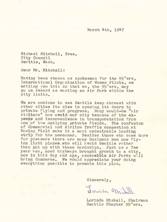 The following year, Lorinda Miskell wrote to City Council on behalf of the Seattle chapter of the International Organization of Women Pilots, also known as the 99'ers. The group was concerned that Seattle was falling behind other cities "in opening its doors to private flying and progress. Many would be 'air visitors' now avoid our city because of the expense and inconvenience in transportation from one of the outlying private fields." The letter closes by arguing, "Just as a few years ago, good highways brought growth to a city, now in this day and age, accessible Air Parks will bring Commerce."