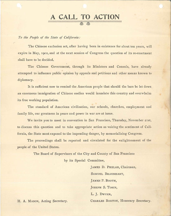 Enclosed with the mayor's letter was an announcement of a California state convention to discuss ways to ensure the Act was extended, along with a "Call to Action" addressed to the citizens of California. This document warned that "should the bars be let down an enormous immigration of Chinese coolies would inundate this country and overwhelm its free working population. The standard of American civilization, our schools, churches, employment and family life, our greatness in peace and power in war are at issue."