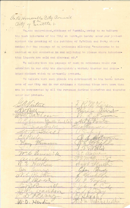 A group of about forty Seattle businessmen petitioned the Mayor and City Council in 1895 to permit amusements (such as concerts, dances, shows, and the like) to be allowed in conjunction with saloons. They wrote that they believed "the best interests of the City of Seattle would be subserved by, and that large revenues could be derived from licensing and allowing amusements under proper restrictions to be carried on and conducted in, and adjoining to places where intoxicating liquors are sold." Signatures on the petition included prominent local citizens such as banker Jacob Furth and a representative of the Schwabacher Company.