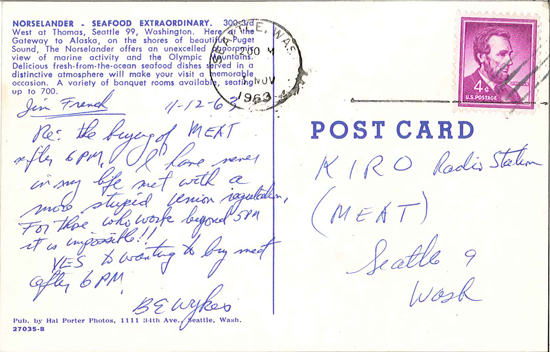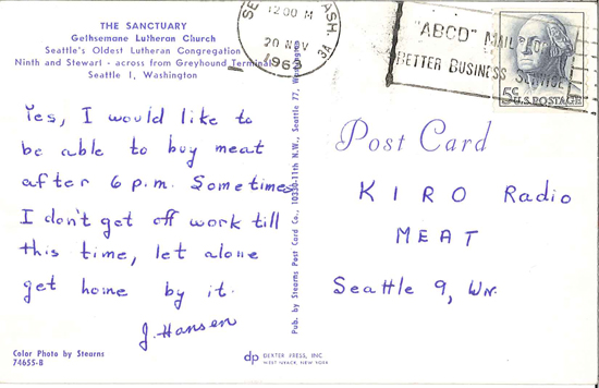 A cache of postcards addressed to "MEAT, KIRO Radio" shows that KIRO had also been involved in the issue, soliciting opinions from the city's meat consumers. Messages on the postcards ranged from "Meat Yes" to "I have long resented the ruling that interrupts the sale of needed meats - hours have nothing to do with our needs." to "I definitely would like to see the 'cutlet curfew' abolished."