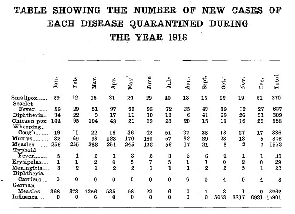 It was the unvaccinated children in the schools that caused it to spread. Being a disease that is spread by personal contact, a glance at the quarantine table will show how rapidly it dropped from 111 cases in May to 85 in June, to 42, 32, and 39 in July, August and September, to jump to 100 in October.