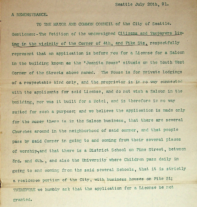 In 1891, almost 100 concerned citizens petitioned the mayor and city council regarding a saloon license application for the southwest corner of Fourth and Pike. The proposed saloon would be in the same building as the Juanita House, which the petition described as "private lodgings of a respectable kind only." The petition (which was titled "A REMONSTRANCE") explained,