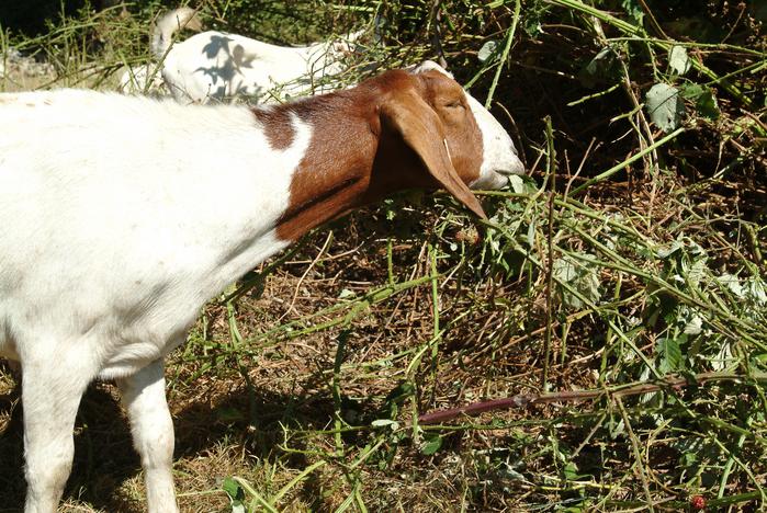The goats' feast was to include "the spring temptations presented by invasive plants, especially Himalayan blackberries." Since more than one goat would be needed to clear the site, the group hired Goat Busters to bring in three critters to do the chomping. The initial plan had been to use "our neighborhood pal Wile E. Goat, a most handsome Nubian-Alpine cross," but he preferred to dine without other goats around, so he was relegated to the role of mascot.