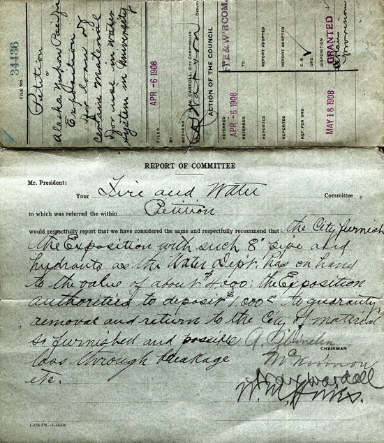 The Lighting and Water Department met with the AYPE Committee regarding pipe, hydrants, and other water equipment needed for use on the Exposition grounds, reporting that the AYPE did not want to buy the pipe outright "but wish to arrange for having it loaned to them by the City." The AYPE's Division of Works agreed that of the 21,000 linear feet of cast iron pipe, 62 hydrants, and seven or eight stand pipes, whatever was not paid for at its cost value would "be removed by the exposition management and delivered in good order to the City of Seattle."