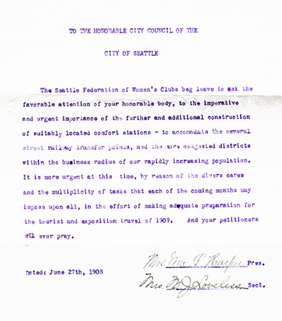 The Seattle Federation of Women's Clubs stressed the "imperative and urgent importance" of additional comfort stations (restrooms). The petition was endorsed by the Board of Public Works.