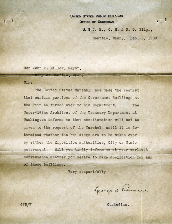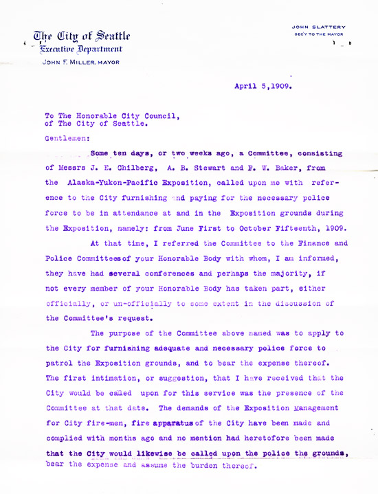 Although funding was provided at the state level, much of the financial burden for the Exposition fell to the City of Seattle. Many city departments worked tirelessly before the AYPE to secure funding or put personnel in place to ensure the fair's success. These departments expressed their concerns, ideas, and requests to City Council and the Mayor through various communications and reports.
