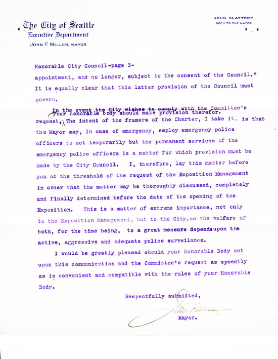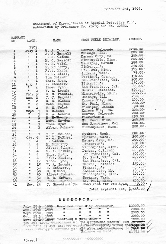 He wrote again on December 2, 1909, to thank the chairman of the Finance Committee for approving his request for additional detectives during the Exposition. He stated that the city was thus kept "free from crooks during the duration of the Fair; and Seattle has set a mark, that has been freely and extensively commented on in police circles all over the country, for the almost entire absence of crime." He provided a statement of expenditures which listed payments to the detectives, their names, and from where they were detailed. Several were from Pinkerton's, while others were from Denver, San Francisco, Kansas City, and St. Paul.