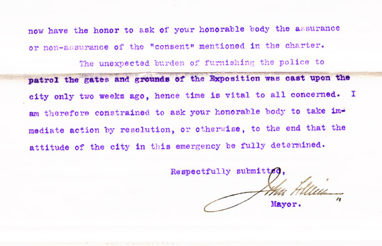 An AYPE Committee met with Mayor Miller to voice concerns about having an adequate police force on the Exposition grounds. The AYPE originally planned to police the grounds and use the city's police department to patrol "the approaches, entrances, street car termini, etc.," but came to the Mayor with a request for the city to assume complete charge, "police the grounds, bear the expense and assume the burden thereof." The Mayor was willing to declare an emergency in order to put an ample police force in place. He agreed to provide 75 uniformed "emergency men," and asked the Exposition to "bear the expense of the ten men constituting the detective corps or plain clothes men," all under the authority of the Chief of Police.