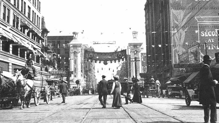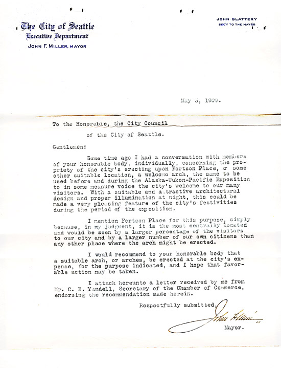 On April 30, 1909, the Seattle Chamber of Commerce requested that "a sufficient sum of money be appropriated with which to construct a Welcome Arch, to be located on or near Fortson Place." With the Mayor's approval, the City Council's Finance Committee approved a $4,000 appropriation for the project. Strehlow, Freese and Peterson contracted with the city to build an arch at Second and Marion designed by Somervell & Cote. The city authorized funds for its construction.