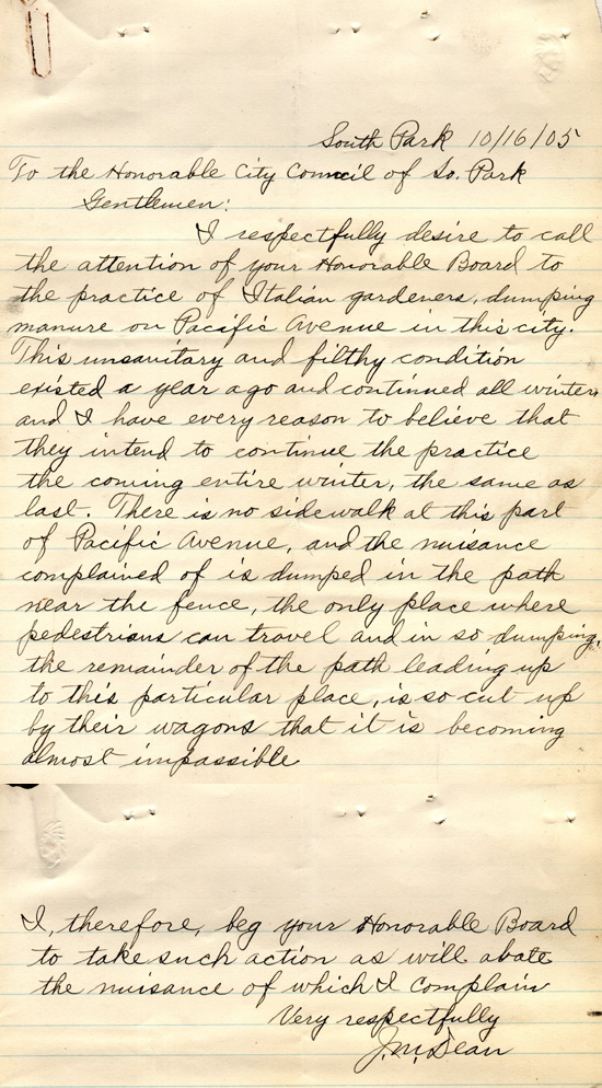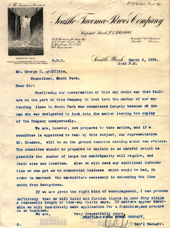 The lack of a safe water supply was the biggest issue facing the town. The town council explored the possibility of getting its water from Georgetown (which had mains that ran through South Park) or from nearby farms, but none of these plans turned out to be viable. An independent water company's supply ended up being contaminated by sewage. The continuing water woes, along with difficulty in securing electrical service, were large factors in the decision to petition for annexation. As the town continued to grow, it was clear these problems would only become more acute.