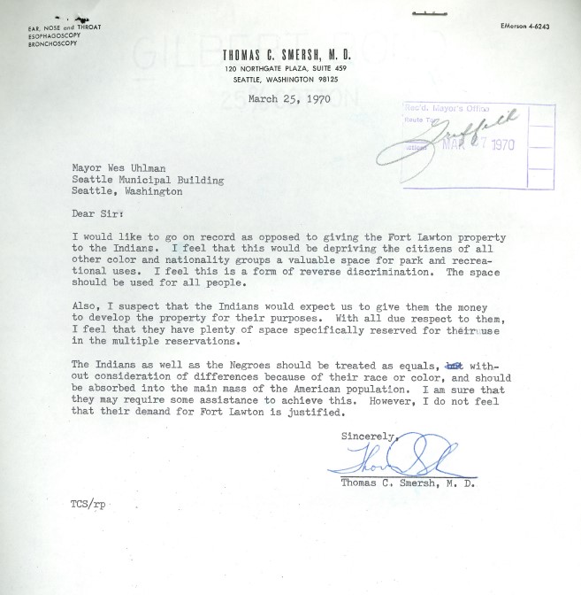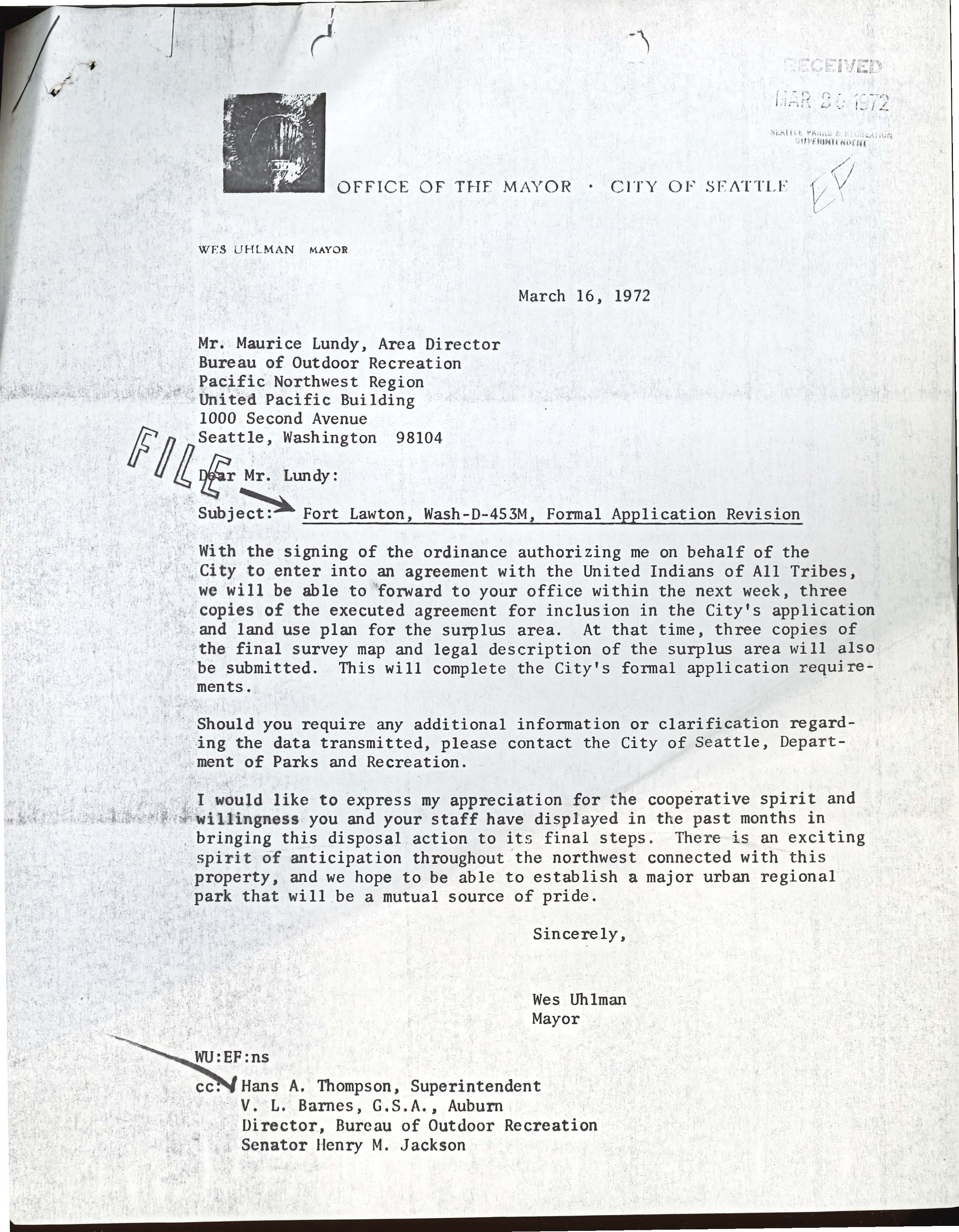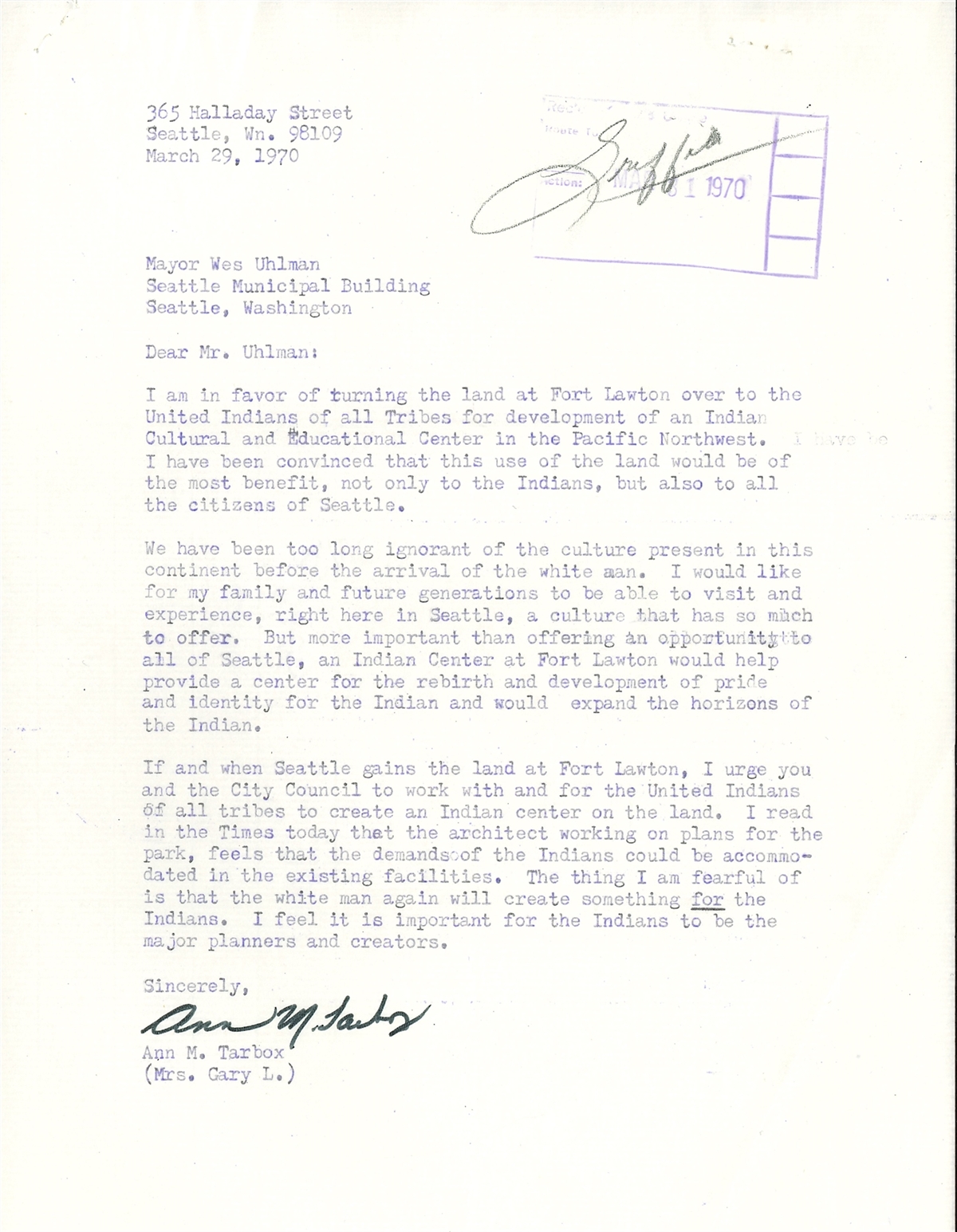 Mayor Uhlman replied to letters in favor of the UIATF claim by reiterating his strong support for developing the site as a park. "I believe that to divide the Fort Lawton land, or to give all of it to Indian groups would seriously restrict its public recreational development," he wrote. "However, I believe equity requires that all other interested groups - Indians included - should share in the planning of the recreational uses of the area. There is room, therefore, for Indian-oriented facilities and activities. But whatever the ultimate response, the response should come as a result of a planning process, not as a precondition to it."