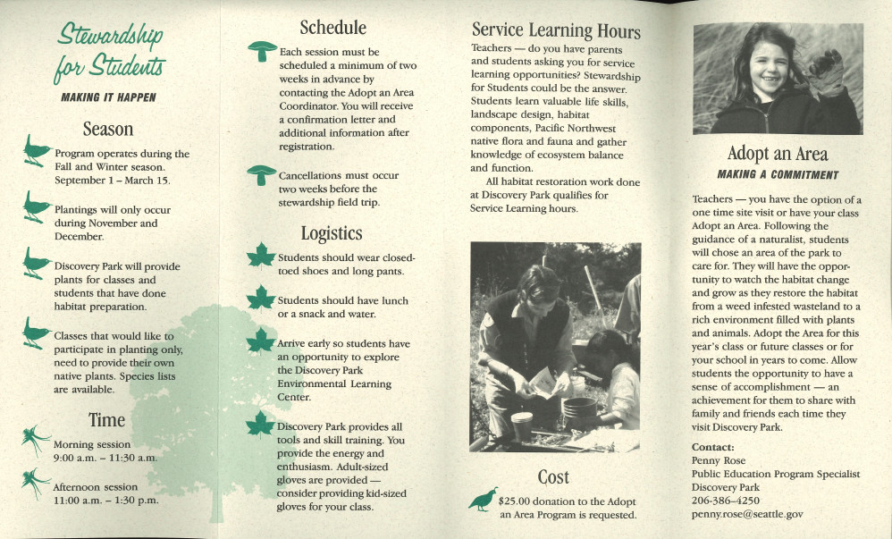 Working alongside park employees to manage Seattle’s largest park, volunteers played an invaluable role in Discovery Park. Opportunities such as docent programs let those who enjoyed working with children lead environmental education outings; others supported the park by joining the Park Advisory Council, and families and individuals were able to Adopt-an-Area to steward specific habitats. Volunteer programming continues to be a cornerstone of community involvement in the park.