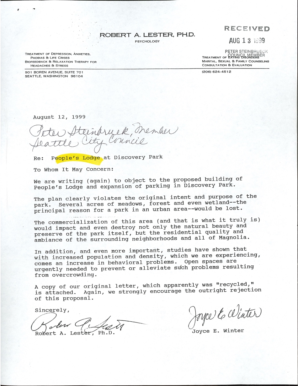 Friends of Discovery Park mobilized in opposition, and a new group called Coalition to Save Discovery Park formed in protest to the proposal. In a letter to Mayor Schell in May 1999, Bernie Whitebear defended the project against the coalition's "exaggerated rhetoric that has almost no factual basis." He outlined how the lodge was consistent with the original 1972 lease and agreement and approved by the city and author of the park's master plan, Dan Kiley. He also spoke to the frequent claim that to build the lodge would irrevocably disrupt the natural state of the park. "It is sadly ironic that some people claim that the Native American People's Lodge is going to harm the 'wilderness.' The wilderness left the beautiful bluffs of Magnolia 100 years ago and cannot possibly return in the middle of our urban metropolis. Discovery Park is no more pristine in Magnolia than Carkeek, Lincoln, or Seward Parks are in their neighborhoods." He further emphasized that open, tranquil space and a center for preserving, practicing, and learning about Native cultures "can easily exist side by side."