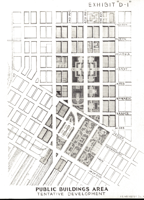 The Planning Commission submitted a "Report on Proposed Public Buildings Area" in 1945 which incorporated Bartholomew's work. The report defined the "Public Buildings Area" as "a space set aside in the city's planning program for the location of government offices." The Public Buildings Area was specifically not intended to be a Civic Center, such as San Francisco had, which incorporated cultural institutions. The report identified the two blocks between Third and Fourth Avenues from James Street to Columbia as "the best sites for any public buildings" because of the proximity both to businesses and other governmental offices.