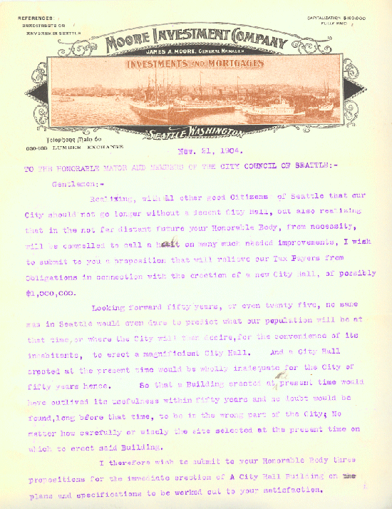 Mayor Richard Ballinger, in his 1905 Annual Message, recommended creation of a nonpartisan commission "to act with the city council in devising plans, ways and means for the early construction of a new City Hall at some suitable location." No apparent action was taken on Ballinger's suggestion.
