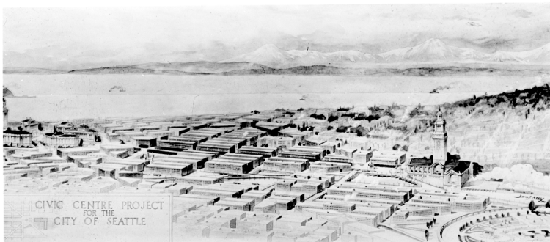 The Civic Center was only a small part of Bogue's plan. His two-volume report included an elaborate and well thought out transportation system, including rapid transit; a plan for the Seattle coastline; and a proposal for an expansion of the parks and boulevards, including a recommendation to set aside Mercer Island as an "island park - a people's playground, worthy of the city of millions which will someday surround Lake Washington."