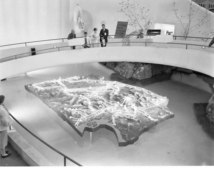 The relief map used electricity to illustrate how electricity was generated. The map was installed on March 30, in plenty of time. Visitors could look down on the electrified map from the ramp to the Pavilion. A mural was also installed inside the Pavilion and lit from behind. In addition to illustrative panels about water as an energy source, the Pavilion also displayed information about future power from solar and atomic energy.