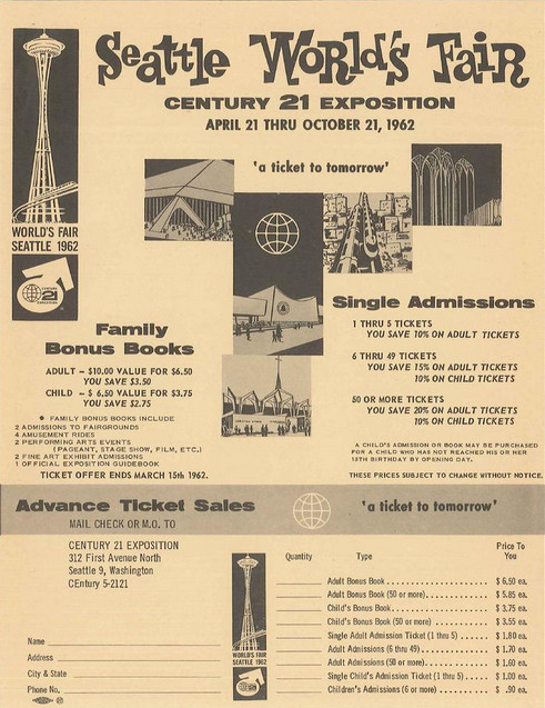 With a theme emphasizing the future, tickets for the Century 21 exhibit went on sale early in 1962. Tickets in advance for one adult were $1.80.