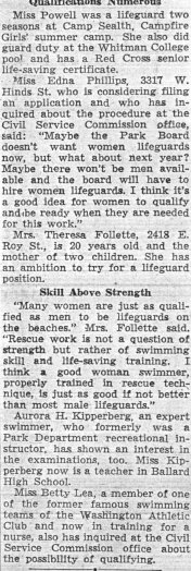 During World War II, the Parks Department was short of lifeguards. Three women applied for lifeguard jobs in 1941. The first to apply was Alice Powell, the daughter of City Council member Mildred Powell. She was a lifeguard at the Campfire summer camp Camp Sealth and was a lifeguard at the Whitman College pool where she was in school. Powell said, "I think women are just as capable as men at handling this sort of a job. A well-trained woman lifeguard is just as good at rescue work and when it comes to handling children and beach patrol, women are more conscientious and probably can do the job a little better." A Seattle Post-Intelligencer article dated August 2, 1941 was titled "Women Seek Lifeguard Posts Despite Park Board Coolness." This coolness was despite Seattle's own Helene Madison having won three gold medals in swimming in the previous decade, proving that women could be quite capable in the water.