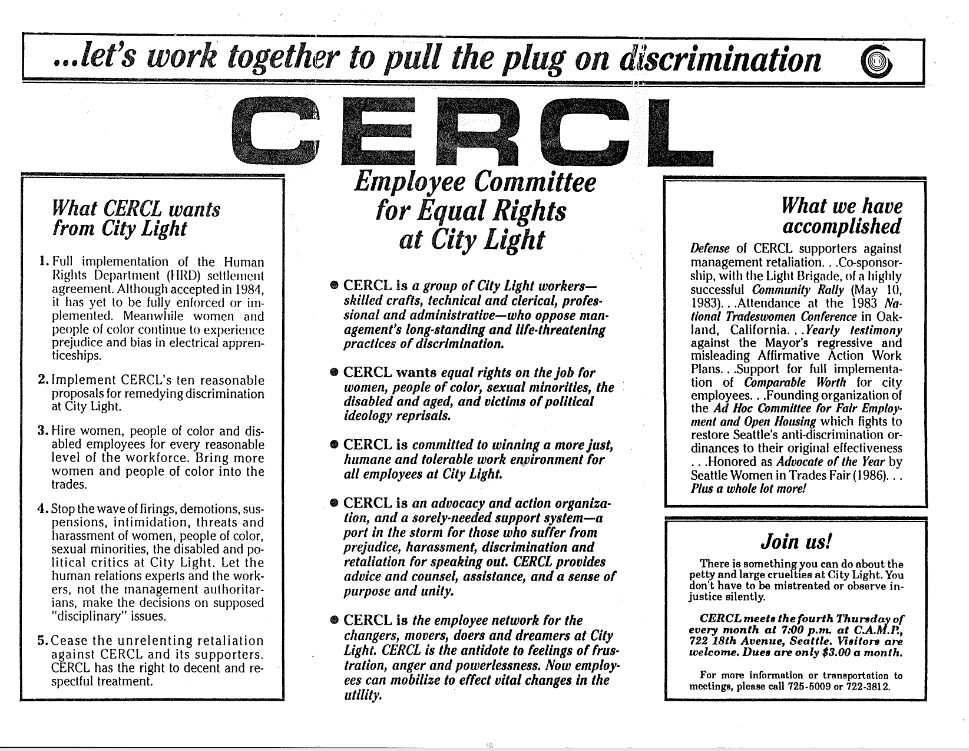 The Committee for Equal Rights at City Light (CERCL) was formed in 1983 following a complaint filed by the Director of the Human Rights Department on behalf of women in the electrical trades. CERCL submitted ten proposals to help resolve issues of race, sex, and political ideology discrimination at the utility.