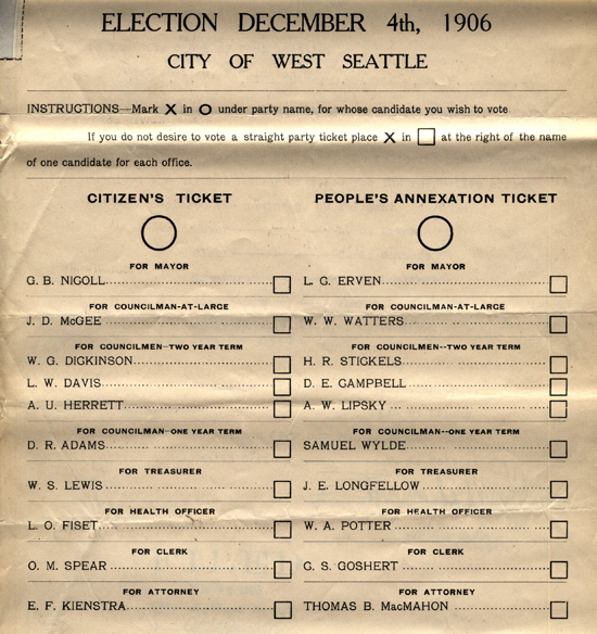 Some portions of West Seattle and South Park were towns in their own right before they were annexed to the City of Seattle in 1907. SMA holds records of the two towns pre-annexation. You can read about the annexation of West Seattle, Georgetown, and South Park in an online exhibit and learn more by exploring our interactive annexation map.