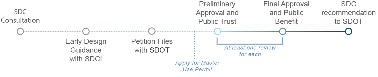 Information provided to us shall include all items outlined in Section 1 - Getting Start of the Seattle Design Commission Handbook as well as any additional information developed in conjunction with City staff or the applicant team. We will evaluate and then make recommendations on the impacts to the public trust functions of the rights of way impacted by the vacation request. We will vote on this phase of the project and will include recommendations and any conditions of approval.