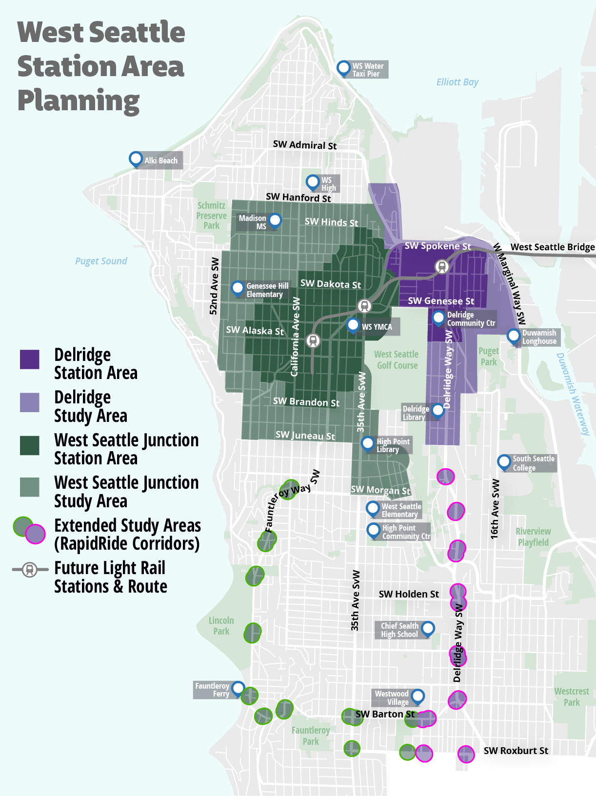 Download the West Seattle Station Area Planning map. Areas featured on this map are the Delridge Station Area, Delridge Study Area, West Seattle Junction Station Area, West Seattle Junction Study Area, Extended Study Areas (Rapidride Corridors), and Future Light Rail Stations and Route. Please email us if you need further assistance reading this map.