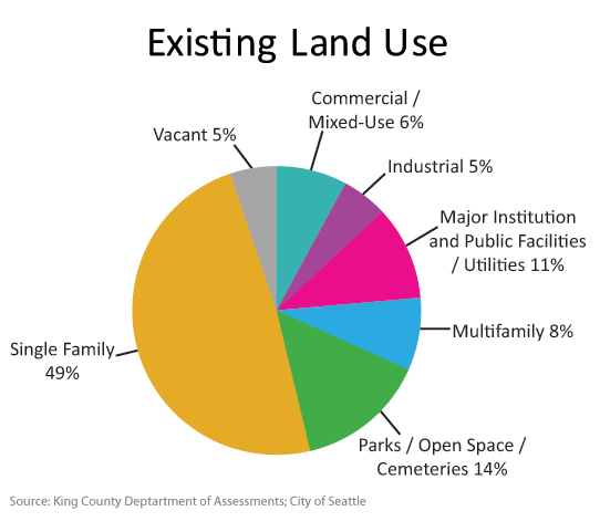 Existing land use in Seattle: 49% for Single-family, 14% for parks/open space/cembetaries, 11% for major institutions and public facilities/utilities, 8% for multifamily, 6% for commercial/mixed-use, 5% for industrial, and 5% vacant. Of the new residential units built between 2005 and 2012, 40%  were in Urban Centers, 19% were outside Urban Villages, 19% were in Residential Urban Villages, and 14% were in Hub Urban Villages
