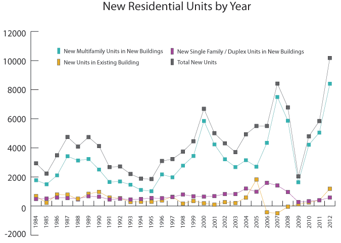 • Residential construction permits: Seattle is experiencing high volumes of residential permits with historic highs of residential units in the permit pipeline for 2012. View the new residential unit graph.