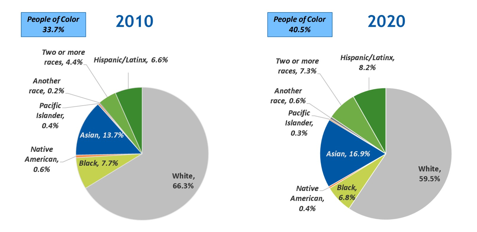 Two pie charts comparing data regarding people of color in 2010 and 2020.