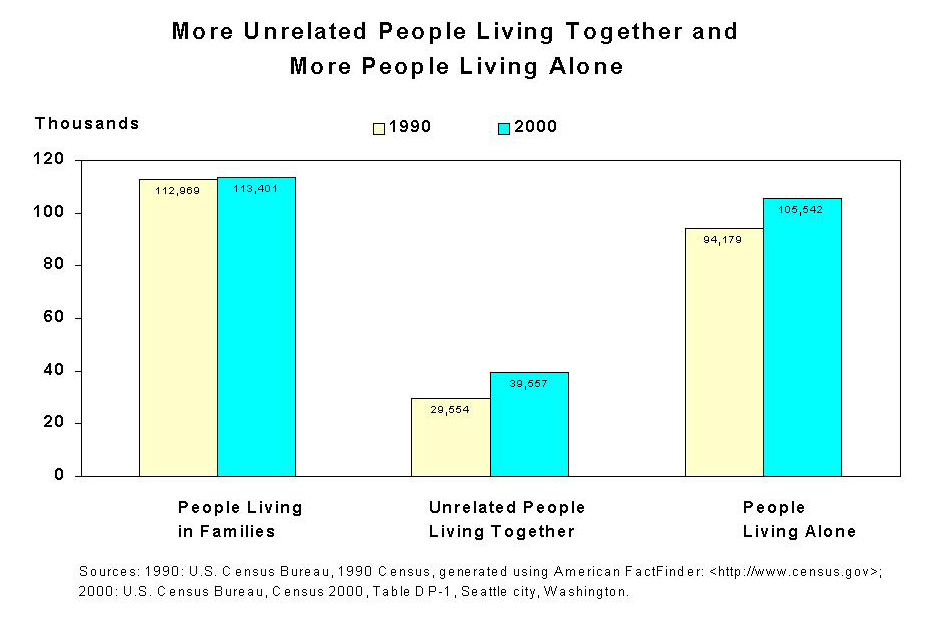 Seattle was unusual for its high proportion of one-person households. This type of household was more common in Seattle than it was in the county, state, or in the nation. Two of every five Seattle households is home to just one person – 41 percent, up slightly from 40 percent in 1990.