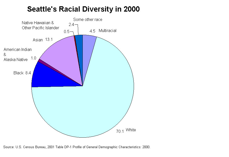 The largest non-White racial group in Seattle is Asian (14 percent of the city’s population), followed by Black or African American (8 percent). Five percent of Seattle residents indicated two or more races on their Census form in 2010.