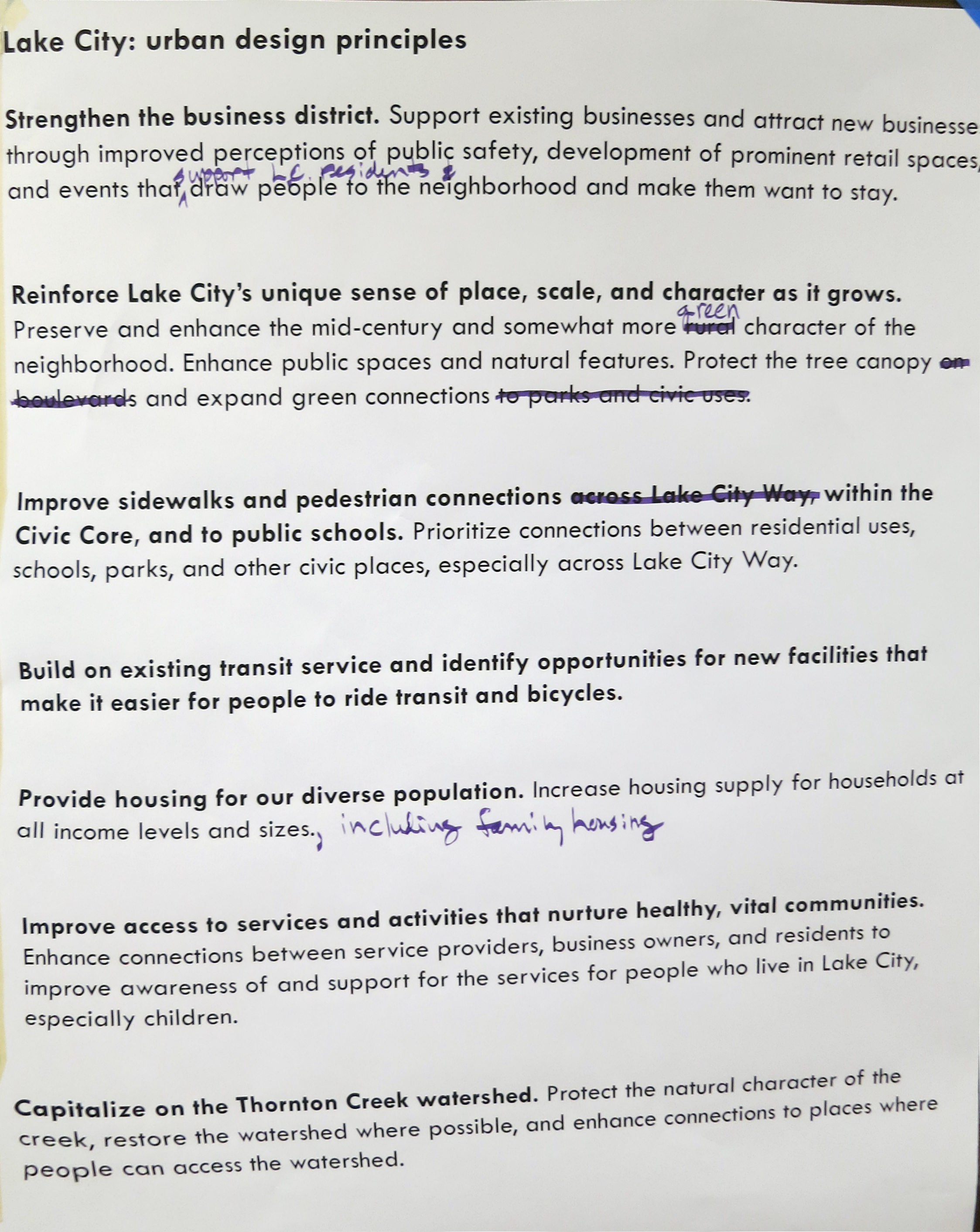 Continued discussion about project principles and "downtown" Lake City: