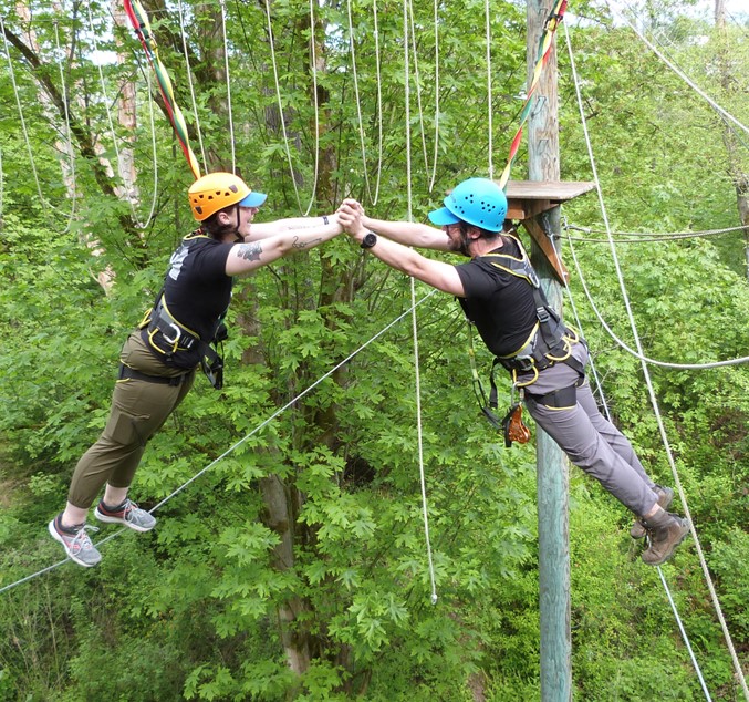- Trapeze Jump/Leap of Faith: Climb a telephone pole and leap for a trapeze. Great for personal goal setting with group support. There are critical support roles for participants without leaving the ground.