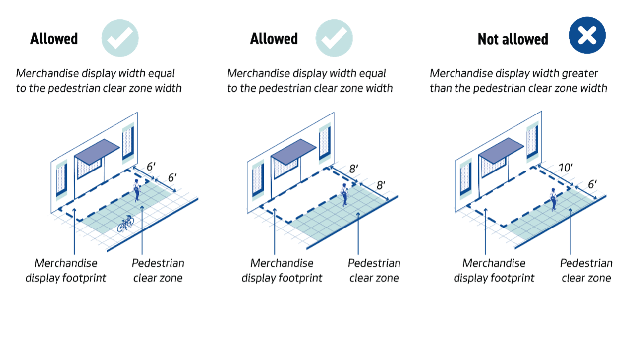 - Sited so that the merchandise display footprint width is not greater than the width of the pedestrian clear zone, see this figure, which shows different configurations that are allowed and not allowed.