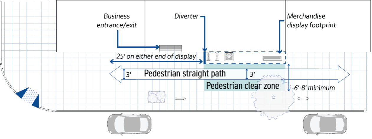 - Sited to provide an unobstructed 3-foot-wide pedestrian straight path within the designated pedestrian clear zone that extends along the permitted area and for 25 feet on either end of the permitted area's boundaries along the block face. The straight path runs along the display’s boundaries and must be continuous straight route that indicates the path of travel and parallels the curb. See this image for an illustration of the pedestrian straight path.
