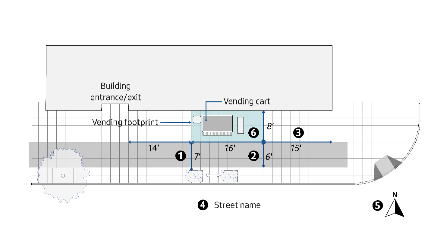 All sidewalk and plaza vending applicants must submit a site plan or equivalent. The plan must show required measurements, clearances, setbacks, street names, and a north arrow.