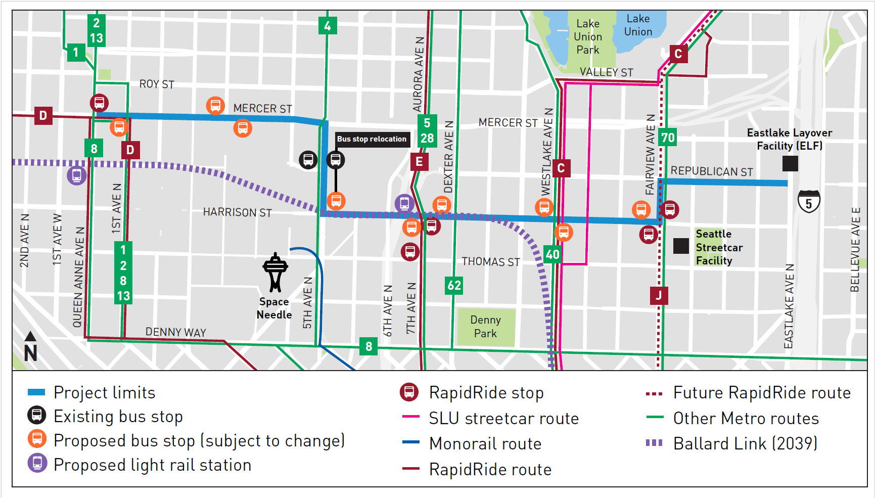 - Adding new transit amenities along 5th Ave N, between Harrison and Mercer streets; and along Mercer St between Queen Anne Ave N and 5th Ave N.