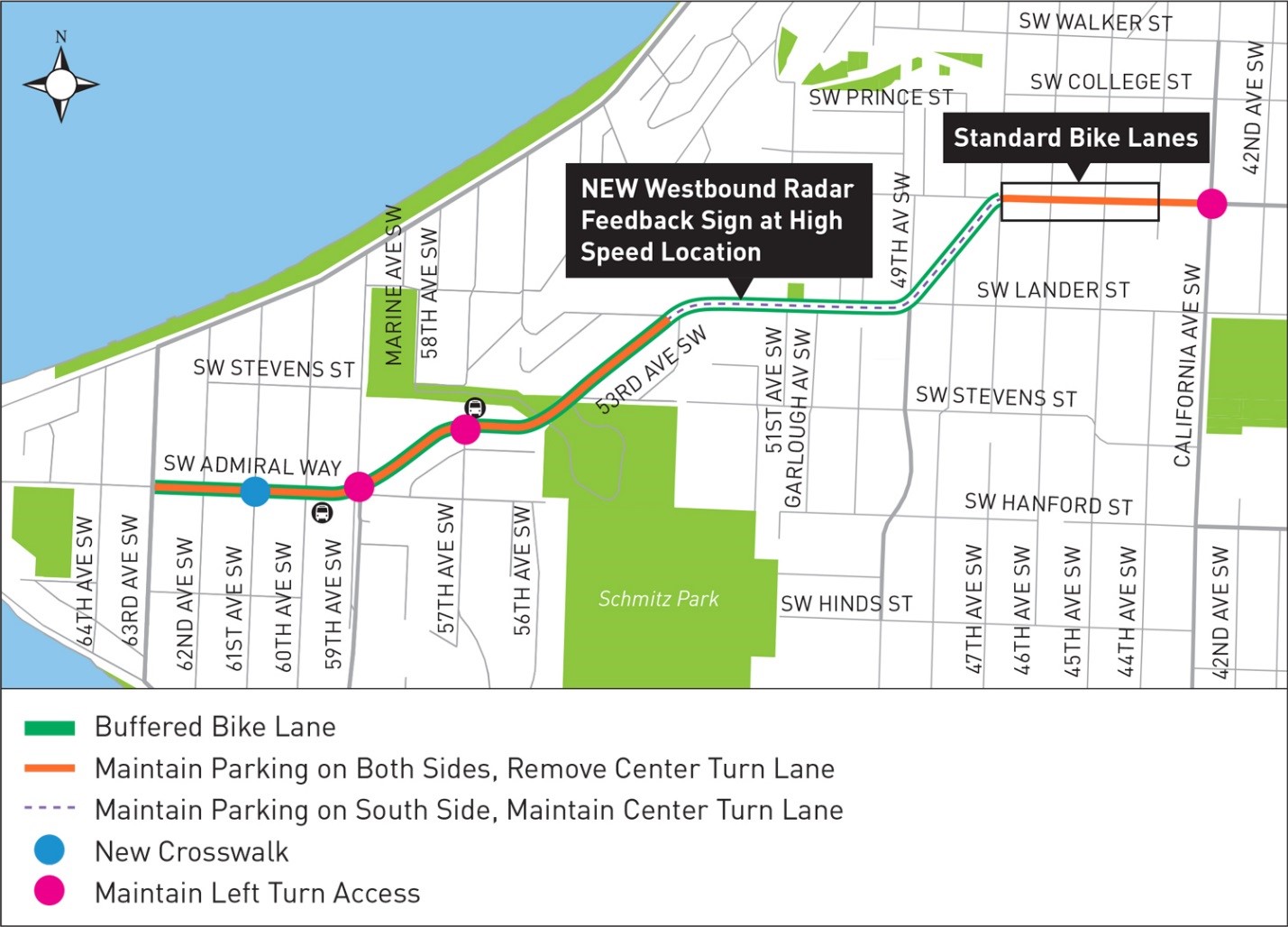 We've added two decorative paint and post curb bulbs, 1 new decorative paint and post median at 59th Ave SW, and 2 new crosswalks. The 2 new flashing school zone speed limit signs can be installed as soon as spring 2018. These changes are intended to provide a safer crossing for students of Alki Elementary School, as well as community members accessing Alki Community Center and Alki Playground.