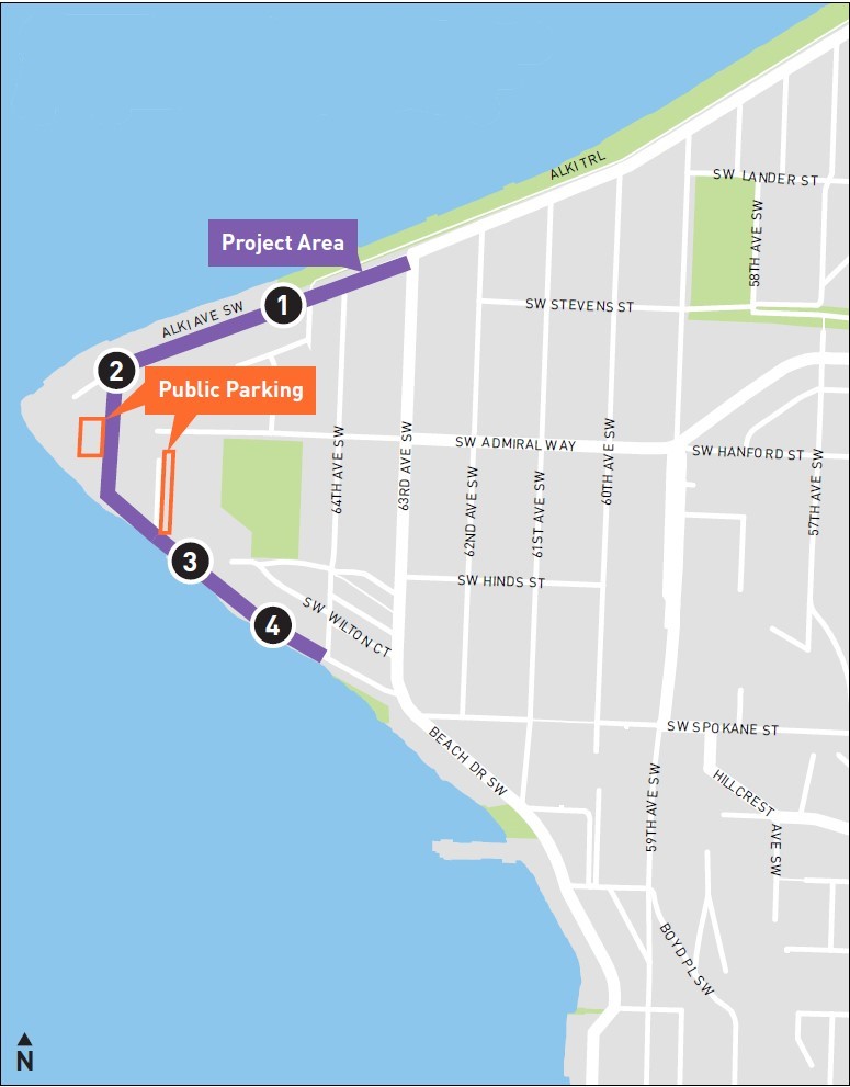 - Approximately 46 parking spaces to remain available on Beach Dr SW, from 3300 Beach Dr SW to 64th Ave SW
