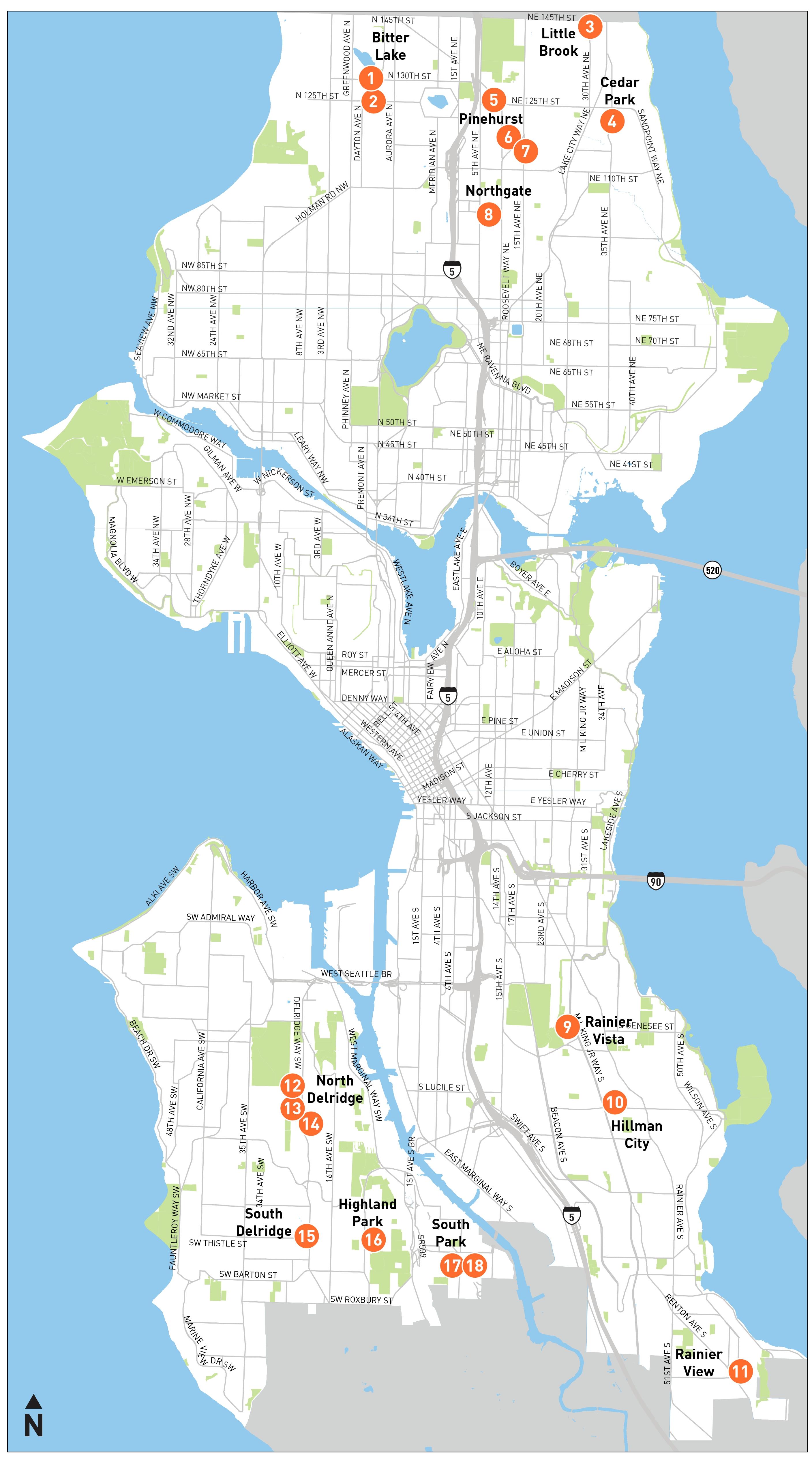 To gather initial project ideas, we looked at what we’ve already heard from the community through the Seattle Transportation Plan, Home Zones, Safe Routes to School, and other outreach efforts. We also partnered with our Sidewalk Development Program and community organizations to host community walking tours and see existing issues first-hand. In each neighborhood, we selected the top community priorities that could be built within one to two years. These safety improvements will connect to new sidewalks, schools, parks, and bus stops.