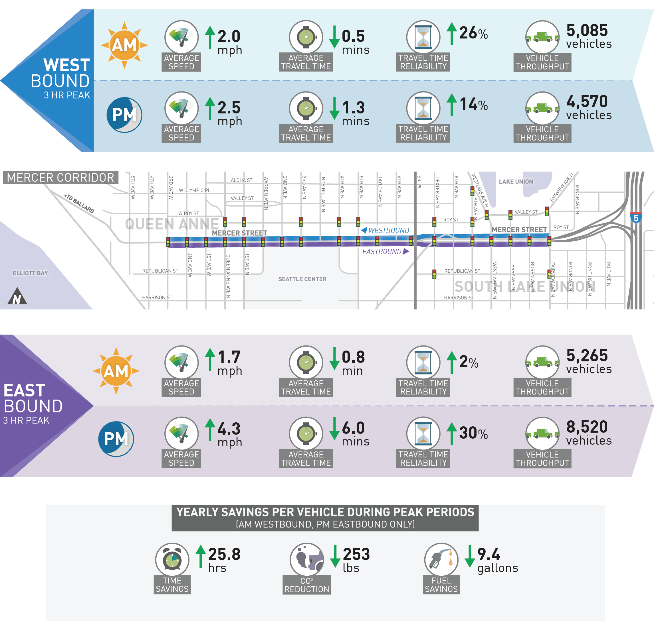 To assess the how well SCOOT is working, vehicle data is being collected daily and compared to historical averages. Reporting periods include morning and evening peak travel times (3 hours) in both the eastbound and westbound directions during the 5-day work week. These periods are when traffic volumes are at their highest. From the data received to date, the following changes have occurred.