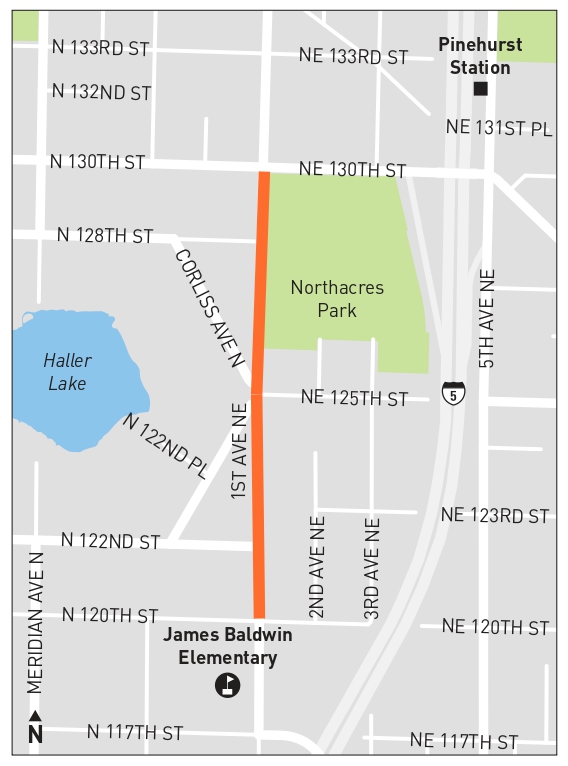 - Improvements to the 1st Ave NE and NE 130th St intersection to make it easier and safer to get to Sound Transit's upcoming Pinehurst Station