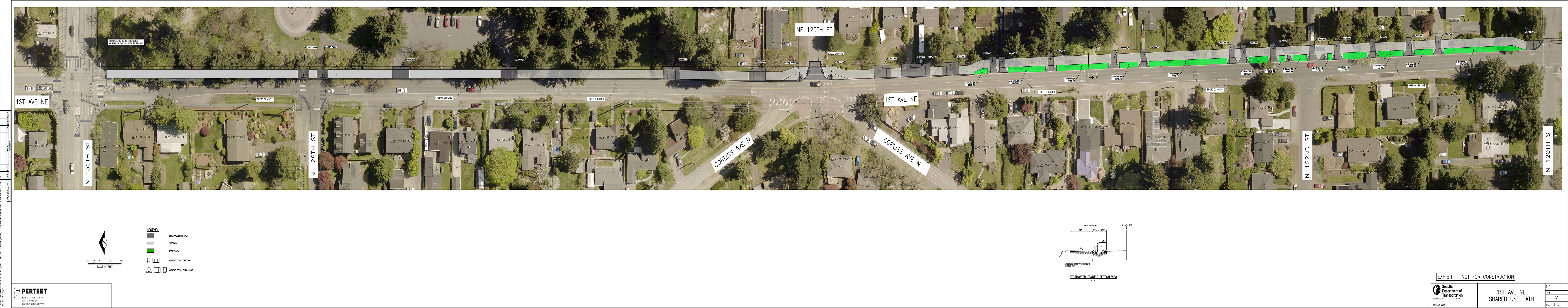 - New 12-ft wide concrete shared-use path for people walking, biking, rolling, and scooting on the east side of 1st Ave NE from NE 130th St to NE 120th St