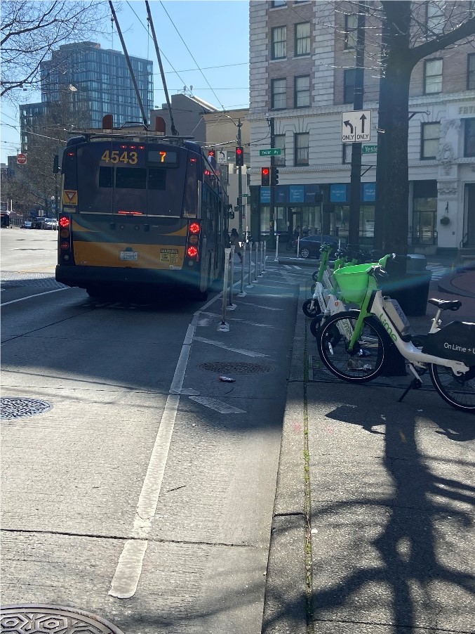Image above shows the conditions in Summer 2024 at 3rd Ave and Yesler Way looking north