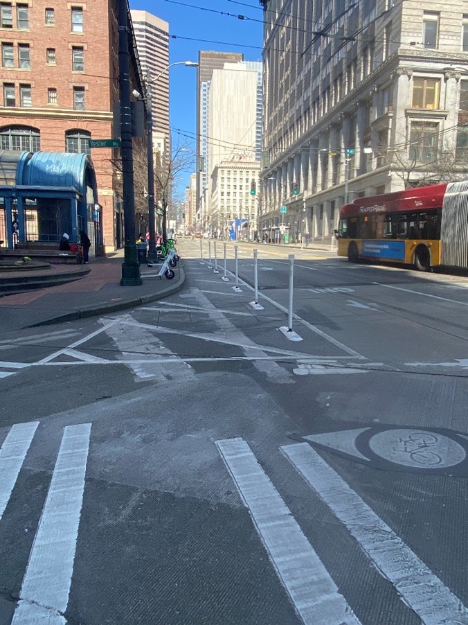 We initially wanted to test the efficacy of traffic control and separating pedestrians and cyclists from car traffic. So we installed paint and posts to remove a northbound travel lane on 3rd Ave across Yesler Way. We also removed the right-turn slip lane from southbound 3rd Ave to Yesler Way. The paint and posts we used created temporary curb bulbs at street corners where pedestrians cross the street. Lastly, the project revised parking near the intersection and connected the Yesler Way’s protected bike lane to 4th Ave S along Dilling Way. In collaboration with King County Metro, we were able to monitor bus traffic and found that buses traveled efficiently with these changes. Based on the success of the pilot project, we are recommending permanent improvements.