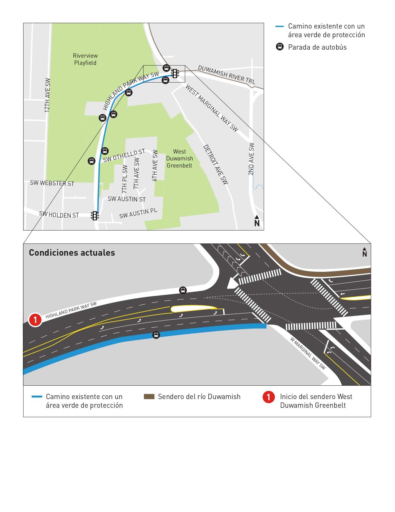 - Crear mejores conexiones para personas que caminan, se desplazan en dispositivos de movilidad en ruedas, andan en bicicleta y usan el transporte público entre Highland Park y el Duwamish River Trail, contribuyendo así a nuestras metas de Acción Climática.